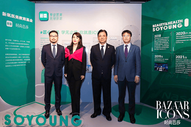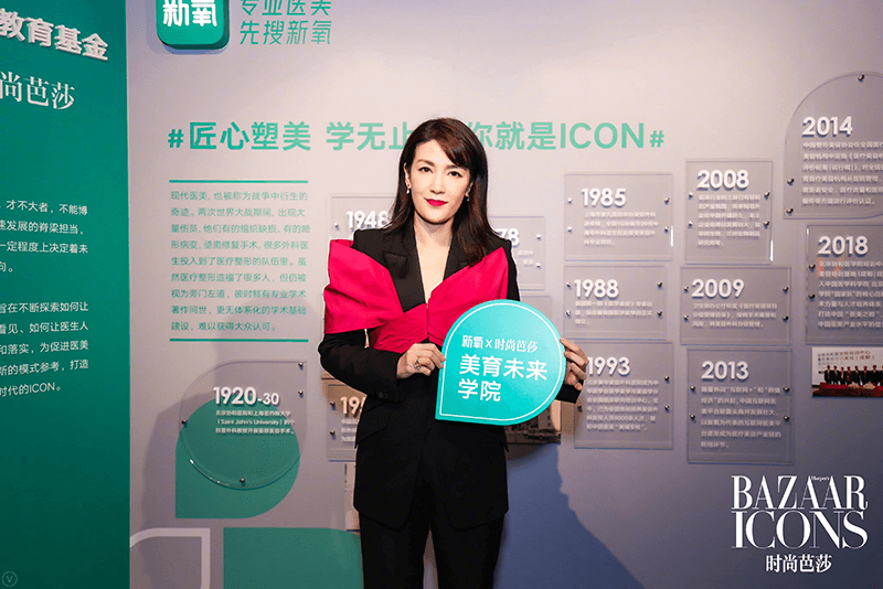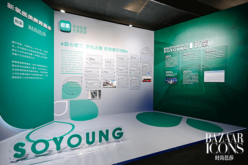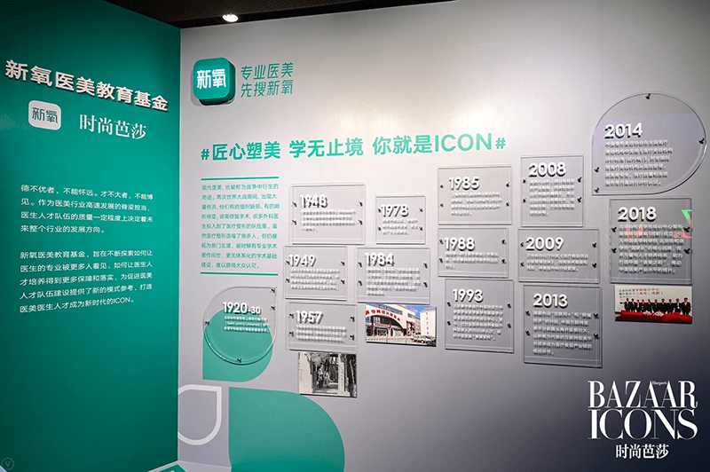 在三面白绿展台上,新氧正式官宣成立医美教育基金,未来将专注医美医生人才培养。时尚芭莎也将携
