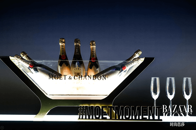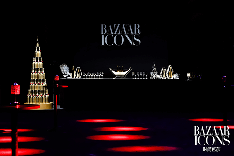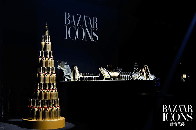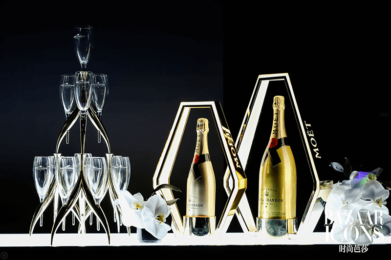 在BAZAAR ICONS舞台的左侧,是一座6层的酩悦香槟塔和酒吧台,到场嘉宾纷纷与全新酩悦香槟